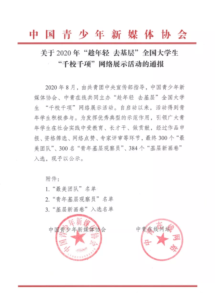 2020年8月,由共青团中央宣传部指导,中国青少年新媒体协会、中青在线共同主办了“趁年轻 去基层”全国老员工“千校千项”网络展示活动。自启动以来活动得到青年员工的积极参与。为发挥典型的示范作用,引领广大青年员工在社会实践中受教育、长才干、做贡献,经过作品申报、资格筛查、网络点赞、专家评审等环节,最终300个“最美团队”、300名“青年基层观察员”、384个“基层新画卷”入选。