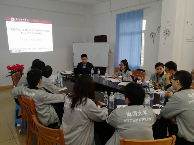 在会上,何博士结合自己13年多的科研经历,作了题目为“海洋环境下混凝土中可传输氯离子迁移的表征方法及其应用”的学术报告。在该报告中,何博士讲述了氯离子在水泥混凝土中以三种形式存在,既自由氯离子,物理吸附氯及化学吸附氯。自由氯离子在固-液界面双电层中的物理吸附氯被称为可传输氯离子。本报告基于孔溶液压滤法、水溶法测量可传输氯离子浓度(分布)结果的计算探讨了可传输氯离子的表征方法中的关键理论和技术,最后就了传输氯离子浓度在NT bulid443和NT build492的应用进行了探讨。何博士所讲述的跟研究中心的研究方向非常类似,对研究中心的研究建设具有重要的参考意义。