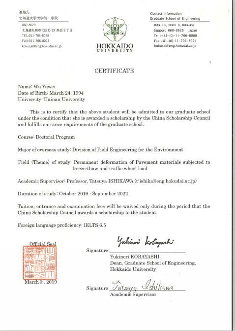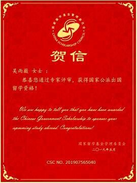 经过国家留学基金委(CSC)评审,2019年度国家公派研究生项目录取结果陆续公布。tyc122ccVIP硕士研究生吴雨薇成功获得国家留学基金委员会资助,将前往日本北海道大学攻读博士研究生学位,这是公司首次获得国家公派博士研究生项目资助,特此祝贺!