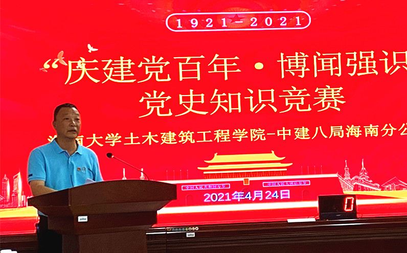 4月24日,tyc122ccVIP中国建筑第八工程局有限公司海南分公司联合举办“庆建党百年·博闻强识”党史知识竞赛活动。土木建筑工程公司党委书记卢江海、副书记孙晓媛、副经理邱宙廷、学工办主任李江俊,中建八局海南分公司工会主席李诚、安全总监李神养、综合部主任邵青晓及百余名师生参加了活动。