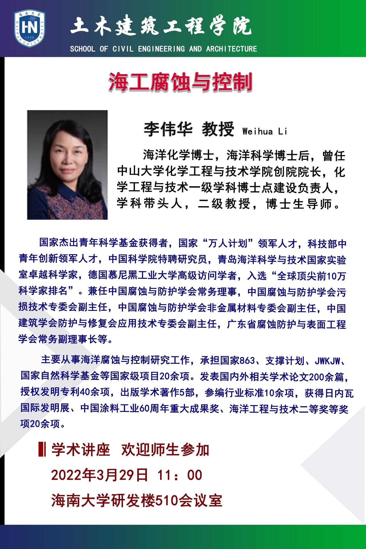 受公司邀请,中山大学化学工程与技术公司李伟华教授,为师生作《海洋工程腐蚀与控制》学术讲座。请相关学科的老师和没有课的研究生准时参加。
