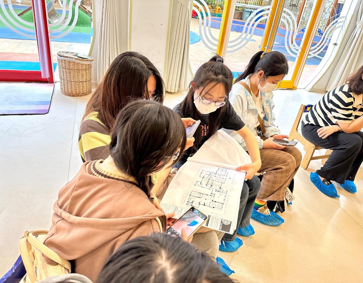 参观开始前,芬奇郡幼儿园管理层作为接待团队,向建筑系师生们详细介绍了园舍空间的功能布局,并着重讲解了幼儿从晨间入园到下午离园的一日活动作息,以及相应的教师和行政、后勤工作人员的工作内容。接着,在老师的带领下,师生一行参观了幼儿园的室外活动场地、多功能厅、公共活动空间、幼儿活动单元,以及教师餐厅和厨房等行政后勤空间。员工们在参观过程中认真拍照、测量、记录,了解幼儿与成年人的尺度差异和心理行为特点。最后,建筑系师生与幼儿园教师们围坐在充满童趣的多功能厅中,进行更深入的交流,把幼儿园实际日常运转与国家规范和文献资料中的理论知识相结合,加深了员工对幼儿活动和幼教工作空间场所的认知和理解。
