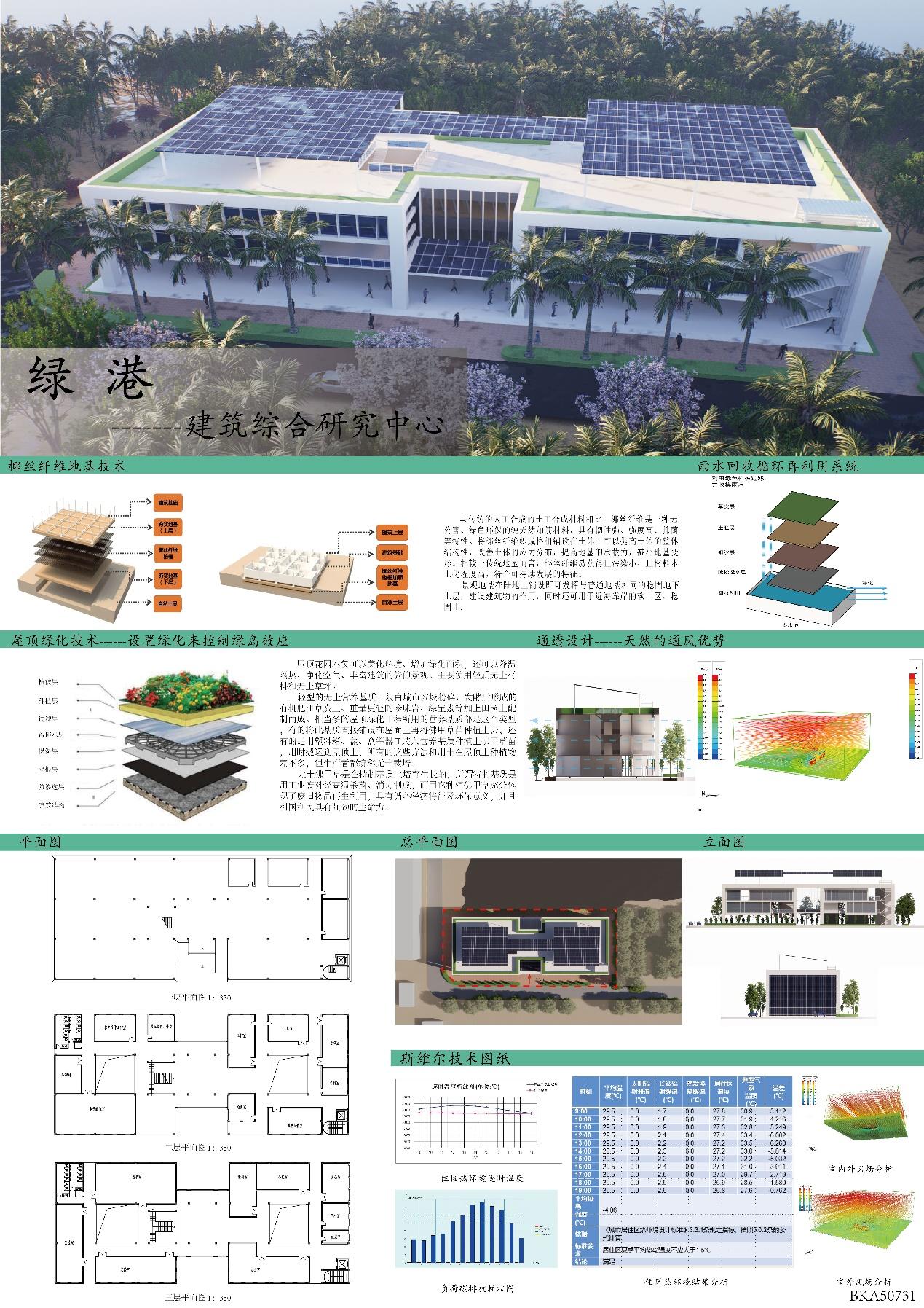 海南属于热带季风气候,长夏无冬,终年湿润。采用垂直式绿化系统,环环相扣充分利用水资源;屋顶放置太阳能合理利用绿色能源;通过采光井和挡光板收集阳光并遮挡眩光;东南向开小口引入主导风,通过走廊引流到建筑各个角落。