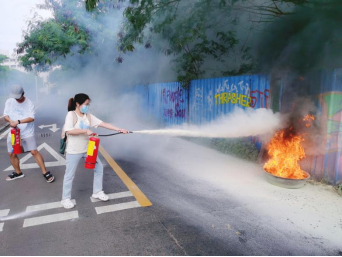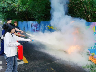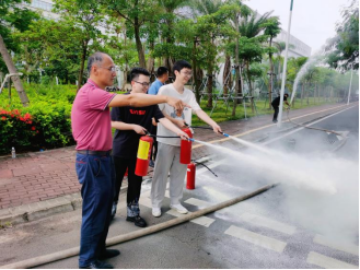林德鑫老师为现场师生演示灭器材的使用。消防知识讲解后研发楼南侧空地进行了消防设施设备操作技能的现场培训,师生们学习灭火器、消防水带的正确使用方法,现场使用灭火器进行了消防灭火演练提高了火灾防范能力。