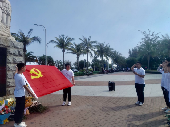 员工党员代表在渡海英雄纪念碑前介绍解放军渡海作战情况,员工党员参加了集体悼念仪式,向烈士敬献鲜花,并面对鲜红的中国共产党党旗,高举右手,重温了入党誓词。